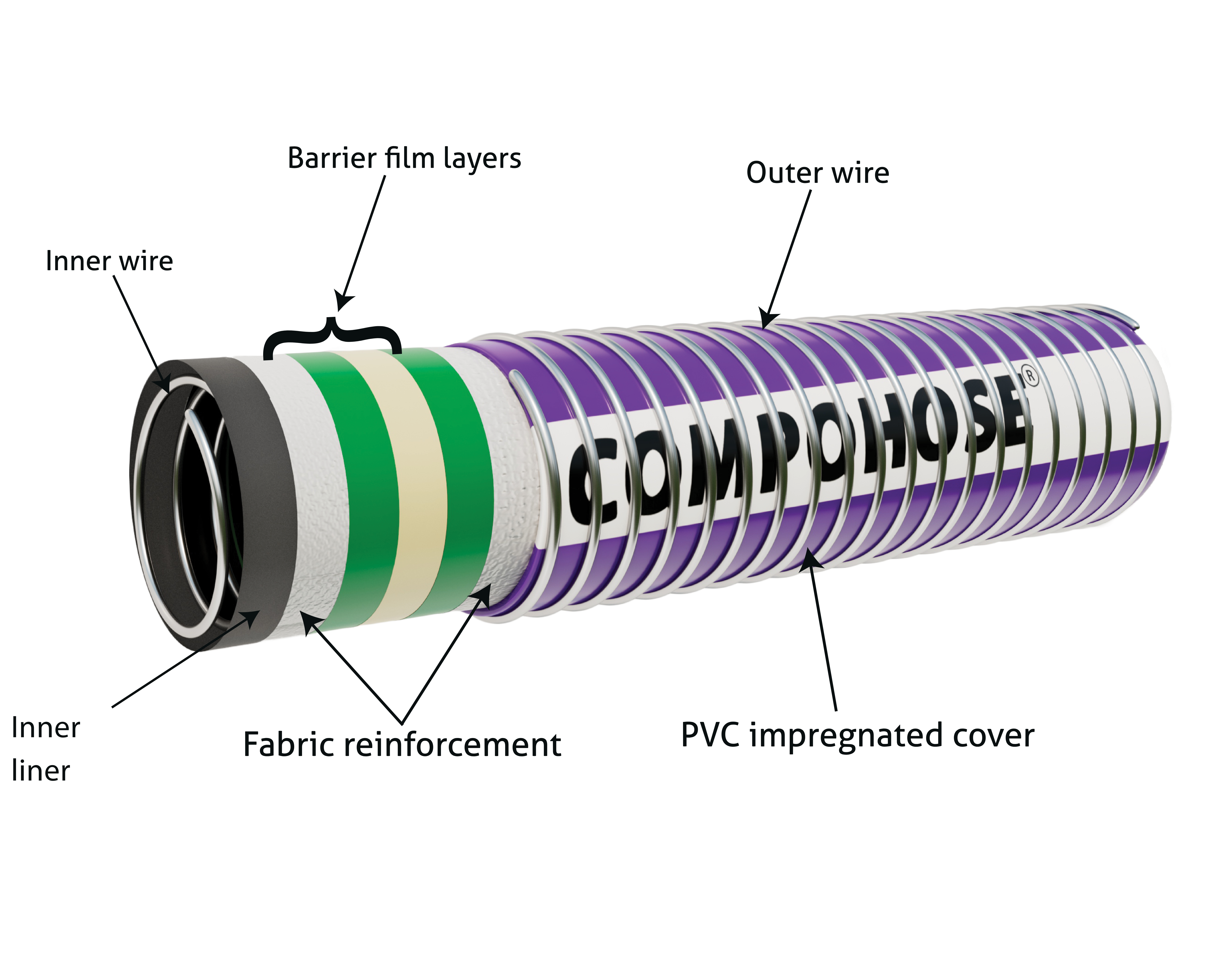 The COMPOHOSE assemblies are ideal for various applications such as loading and unloading Rail Tank Wagons (BTPN), Tank Trucks, Storage tank transfers, and other standard uses. Specifically designed with a Nitrile rubber contact layer, this hose is recommended for Ethanol services where polypropylene is not suitable. The hose features a spiral-wound high-tensile galvanized iron inner and outer wire, providing strength and flexibility to ensure hose integrity under stress and strain.